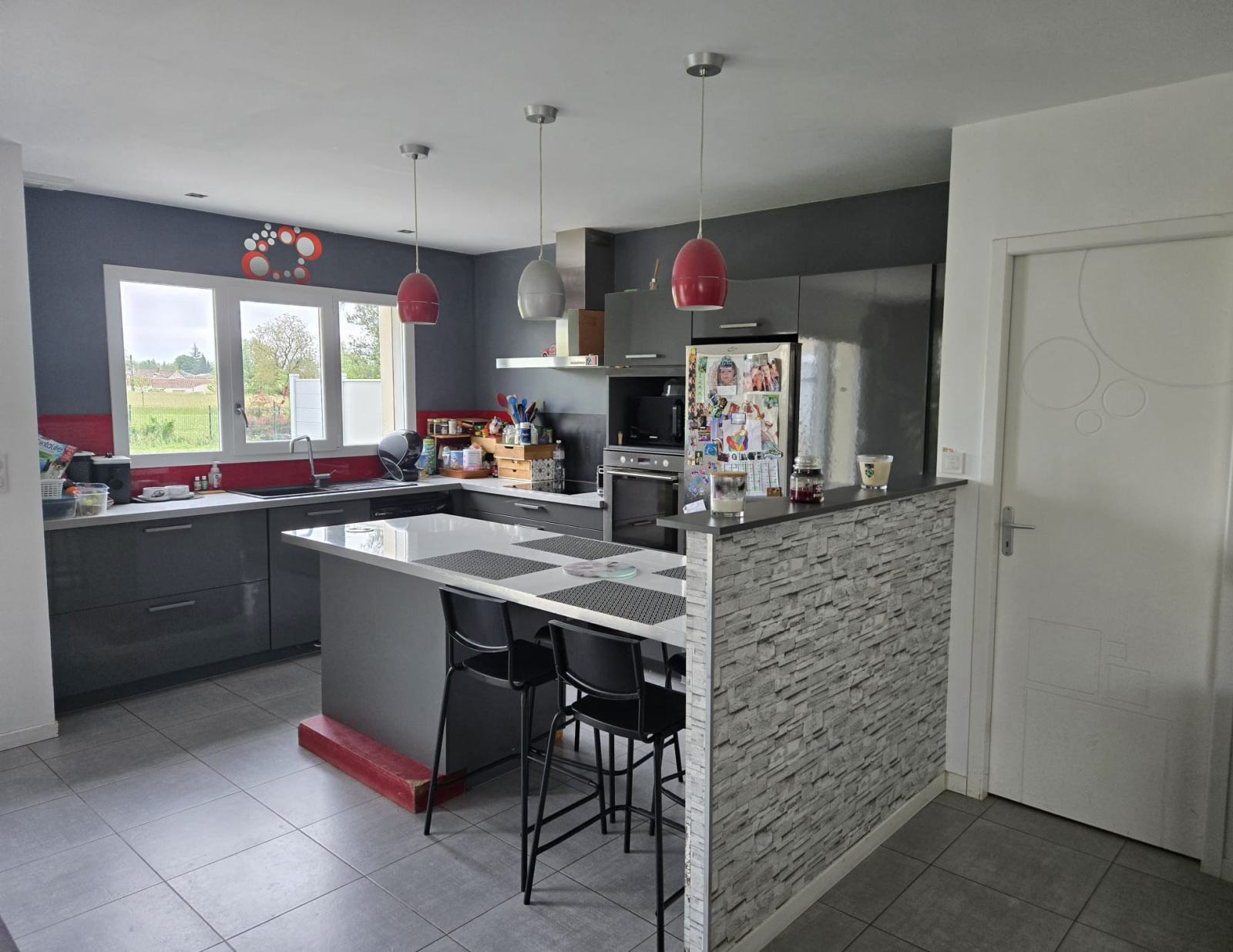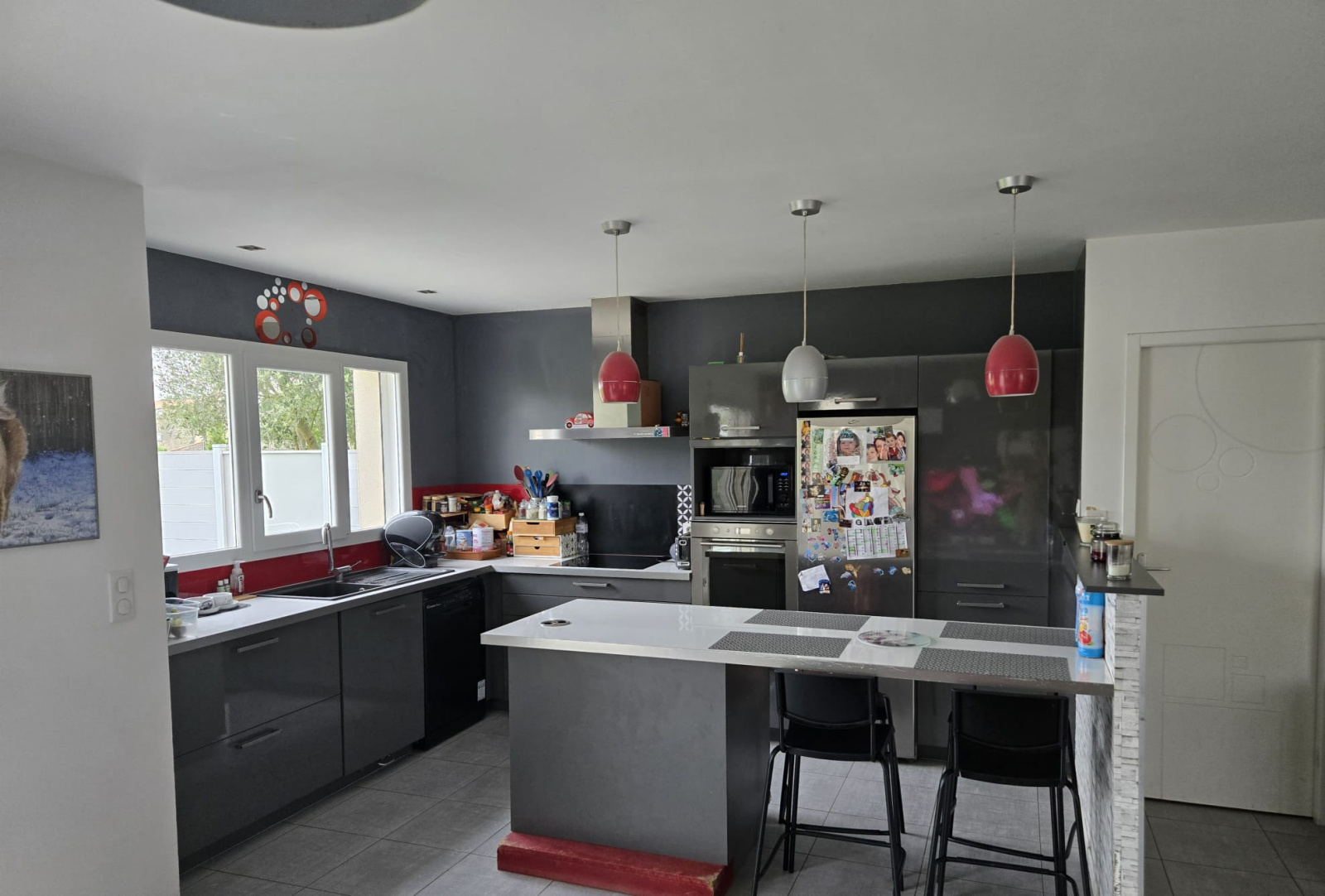 cuisine équipée et aménagée avec table à induction, four, réfrigérateur, hotte, lave vaisselle