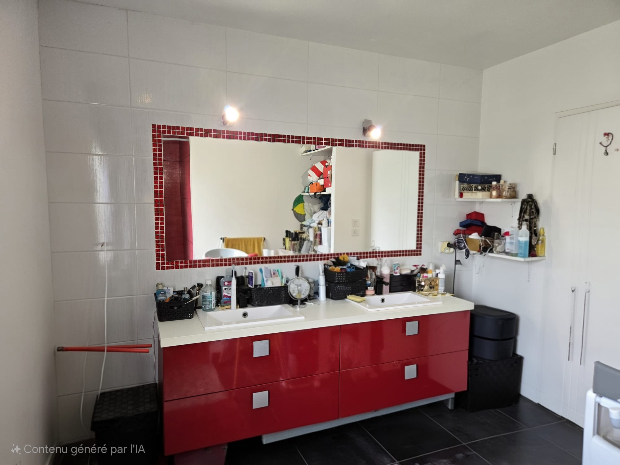 avec douche à l'italienne, double vasque, meuble et sèche serviettes