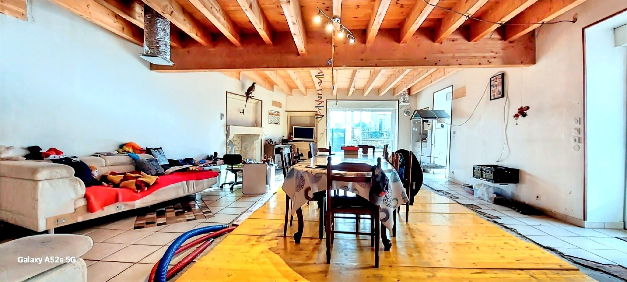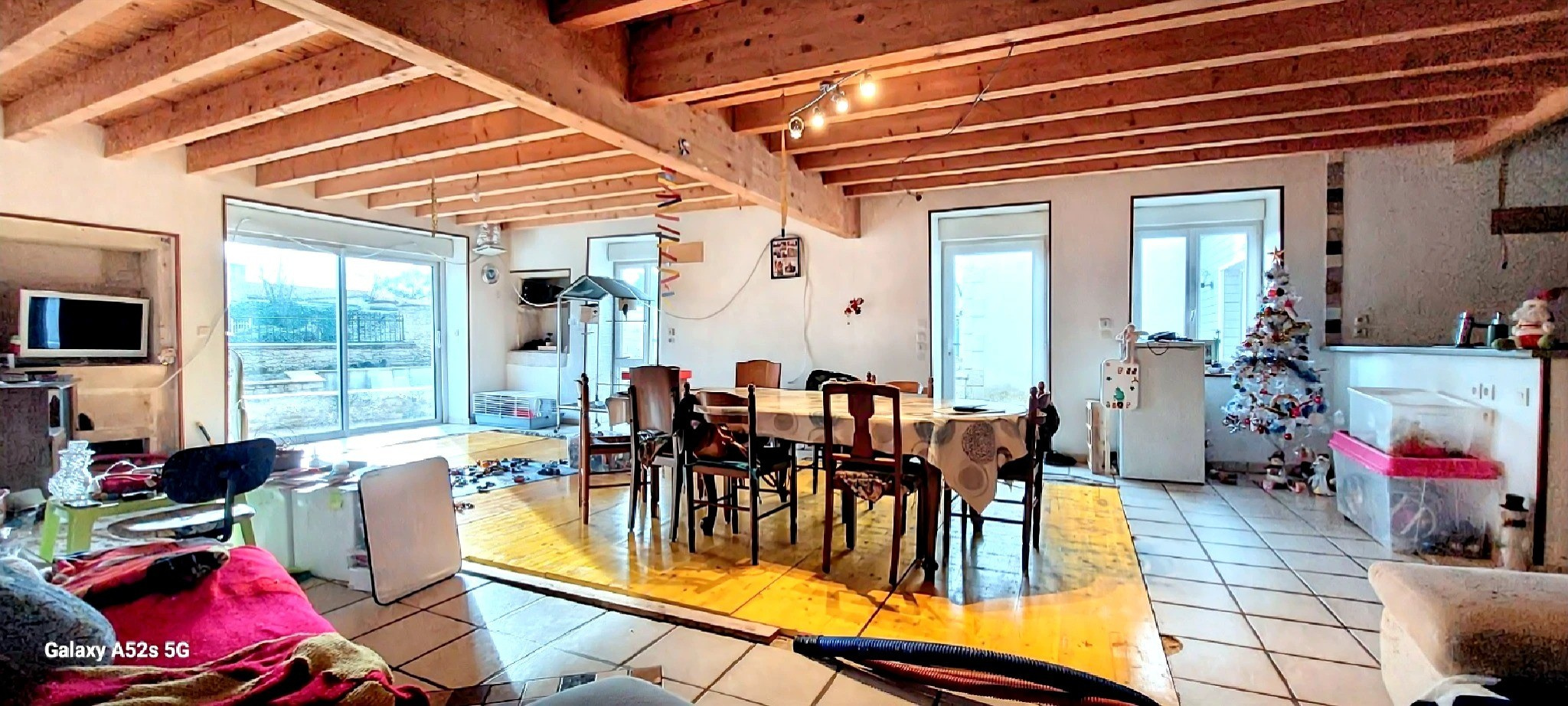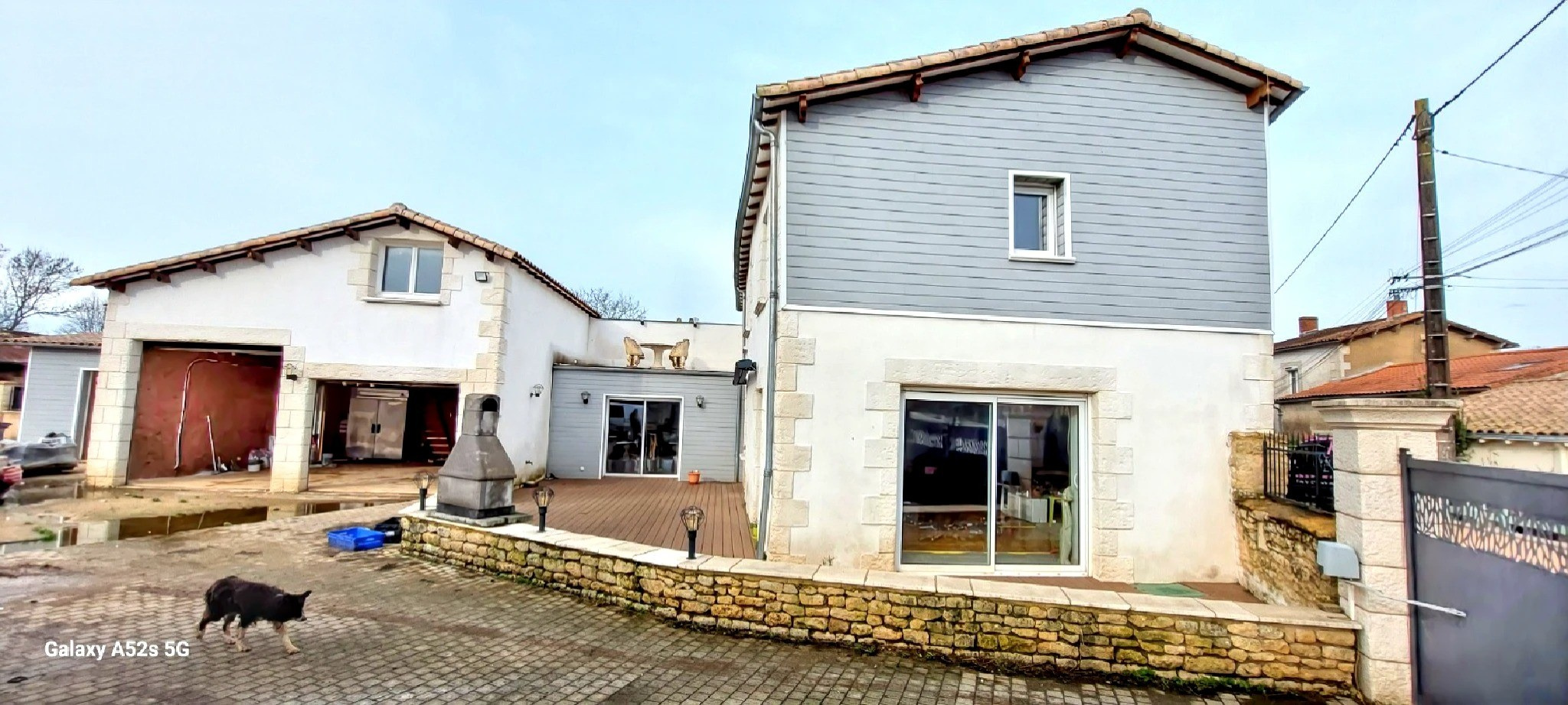 Les annexes constituent un véritable atout : un garage double de 45 m² avec grenier, complété par un préau, offrant de nombreuses possibilités de rangement et d’aménagement.